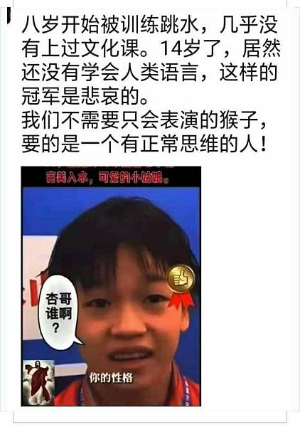 全紅嬋因家境清寒而練習跳水,期望以體育成績來脫貧濟家,可謂乖巧好樣!但童年時光從未逛過動物園,也未走進遊樂園,年幼童真,盡付黨國。全紅嬋的一句私問,顯露的是青春自由無多,國家壓力千金壓頂。一旦失手,頃刻淪為國賊!這意味整個中國對運動員毫無寬容與珍惜之心,「選手」一詞不過是國家霸權的手腳。中國羽球名將陳雨霏亦如是,由於壓力過大,輸球就要承受中國人滔天責罵,只好宣告退出球場、暫離比賽,藉以閃躲國家指令,無奈尋求療傷止痛!
