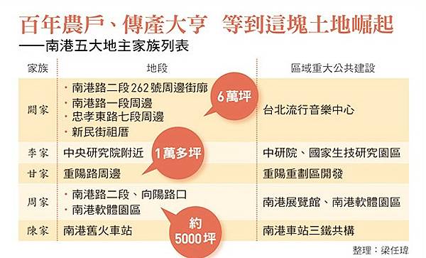 集眾多公共建設於一身的南港,在工廠進駐之前,早在五十年前,其實是一大片農田。當時在這裡種田農耕的家族,現在搖身一變成為黃金地段大地主,除了最大家族闕家外,還有在中研院附近的前立法委員李彥秀李家、南港舊火車站的陳家,都各據一方。 南港地主現身 最高身價2,250億! - 工商時報