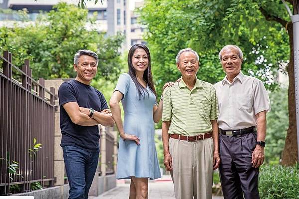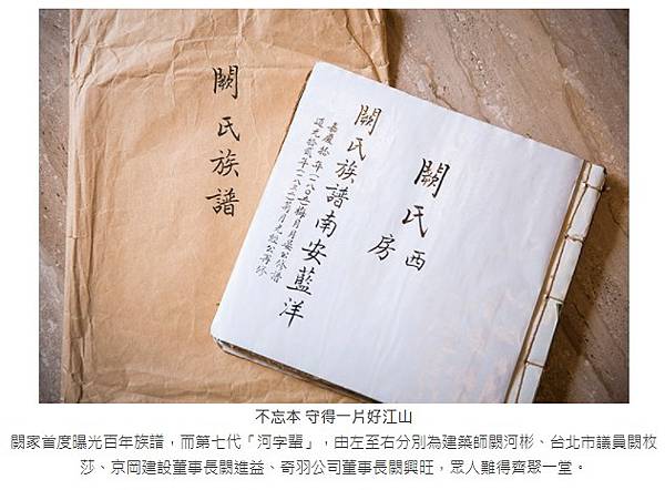 闕家首度曝光百年族譜,而第七代「河字輩」,由左至右分別為建築師闕河彬、台北市議員闕枚莎、京岡建設董事長闕進益、奇羽公司董事長闕興旺,眾人難得齊聚一堂。