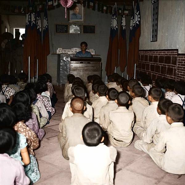 1960年,金門一所小學的教唱課程。此時,教育的物資條件十分艱困,小學生們藉用老宅上課。照片中廳堂前方並無黑板,兩側豎著多面中華民國國旗,所以應屬於廳堂的性質。老師坐在風琴前教唱,小朋友們沒有椅子,全部坐在地上學習。左前方門口站著一些大人,應是外賓來訪。薜培德牧師捕捉到戰時金門孩子們求學艱辛的生動畫面。