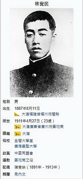 1907年林覺民赴日本進入慶應義塾大學(今慶應大學)文科攻讀哲學,參加同盟會,1911年回中國參加黃花崗起義,與方聲洞領先襲擊總督轅門,受傷被捕,於4月27日被斬首就義!得年24歲。他就是所謂「黄花崗72烈士」(其實不只72人)之中的一人。