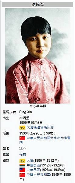 冰心(1900年10月5日-1999年2月28日),本名謝婉瑩,女,福建長樂人,中國現代作家。筆名冰心取自「一片冰心在玉壺」。