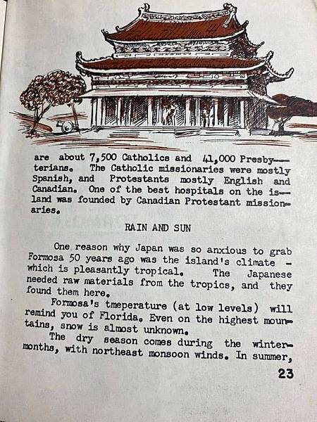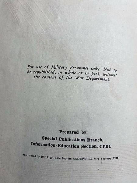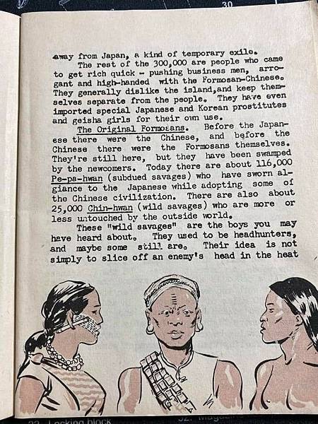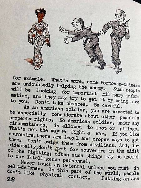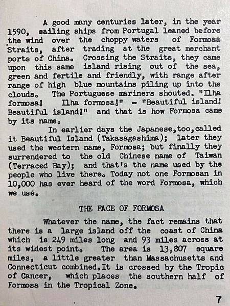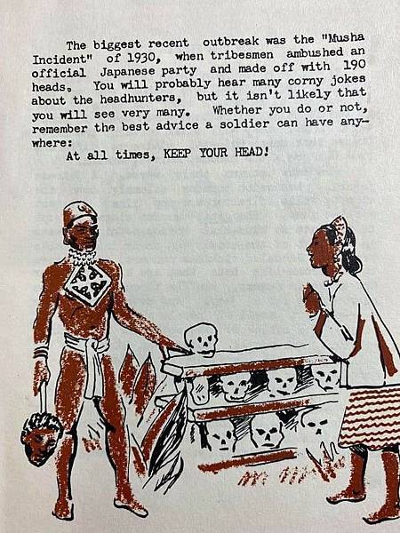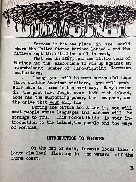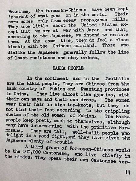 該冊子以概要方式講了台灣的地理,氣候、經濟政治、宗教等等,島上的日本人、漢人、客家人、原住民等族群,較大比例介紹曾讓美軍踢到鐵板的原住民,而有些名稱的翻譯,根本就是來自台語,Chi-Hwan(青番),Pe-Po Hwan(平埔番,但文中誤植成Pe-Pa,推斷可能是排版錯誤,o弄錯成a),Musha Incident (霧社事件)。很難想像這是76年前美國人原本計劃拿取台灣要美軍先做的功課,顯然當時美國人比後來抵達台灣接收的國民黨中國人,還要瞭解台灣。