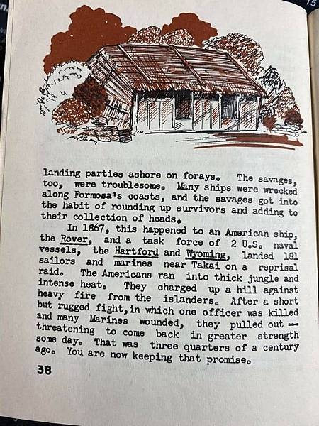 1876年的羅妹號事件,美軍派了哈福德(Hartford)和懷俄明(Wyoming) 兩艘軍艦征討島上的獵頭族人,181名陸戰隊和水手在Takai登陸(還沒查出正確對應名稱,在現今墾丁國家公園園區內),美軍遭遇了南台灣的茂密叢林與酷熱,在一處高地和當地這些人發生交火戰鬥,一名軍官陣亡(登陸部隊的指揮官)多名陸戰隊員受傷後撤退,美軍離開時撂下狠話,我們將會有更多人馬再回來,文末稱四分之三世紀之後,是該付諸此誓言的時候。(然歷史結果是美軍的攻擊軸線優先選擇了沖繩群島,然後廣島長崎投下原子彈,戰爭結束,這些我就無需贅言)