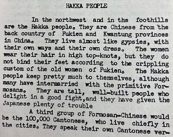 客家人西北和山麓是客家人。 他們是來自中國福建和關東的華人,生活幾乎像吉普賽人,她們有自己的方式和穿着,頭髮梳得很高,但並不像福建的老婦人習慣那樣,把腳綁在殘疾的客家人身上。許多人與原始的福爾摩斯人通婚。 他們身材高大,喜歡打架,給日本人添了不少麻煩,第三批的臺灣華人應該是十萬廣東人,他們主要住在城市裏 他們講自己的廣東話…