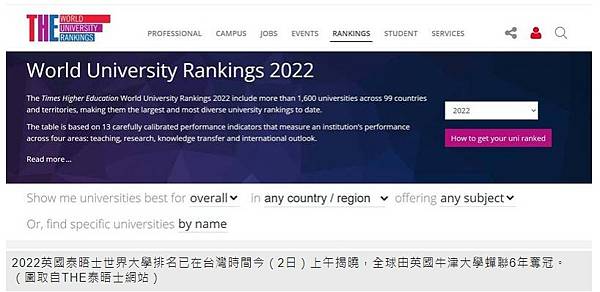 2022英國泰晤士世界大學排名已在台灣時間今(2日)上午揭曉,全球由英國牛津大學蟬聯6年奪冠。(圖取自THE泰晤士網站)