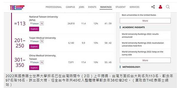 2022英國泰晤士世界大學排名已在台灣時間今(2日)上午揭曉,台灣方面如台大則名列113名,較去年97名降16名,跌出百大榜,但全台今年共40校入整體榜單較去年38校增2校。(圖取自THE泰晤士網站)