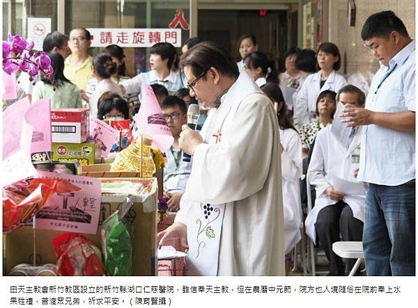 17日是中元節,習俗在這天除祭祖外,更是普渡好兄弟的重要日子,讓鬼門開後,在外遊走的好兄弟飽餐一頓。天主教新竹縣湖口仁慈醫院,雖信奉天主教,但普渡好兄弟不分宗教,今天也舉辦1場中西式普渡儀式,除了念聖經、撒聖水外,也順應地方習俗,祭拜好兄弟並祈求平安。