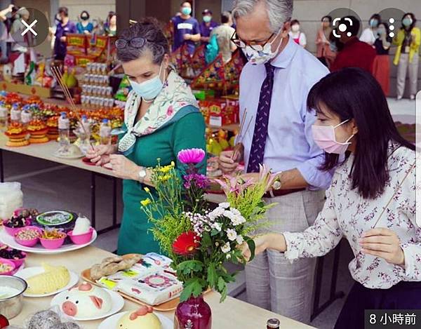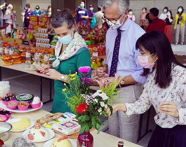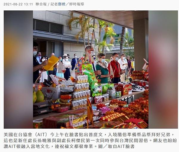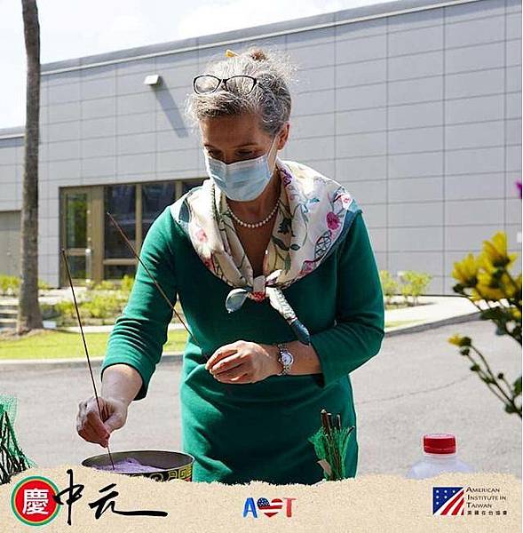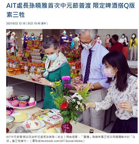 AIT上午表示,最台的「美國愛台協會」當然要入境隨俗,和許多台灣民眾一樣,他們也舉辦了(維持社交距離的)中元普度大拜拜,這是孫曉雅與柯傑民第一次同時參與台灣的民間習俗。AIT備妥了一桌豐盛好料,遵照傳統儀式程序祭拜好兄弟。