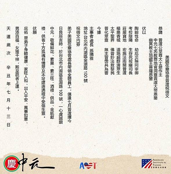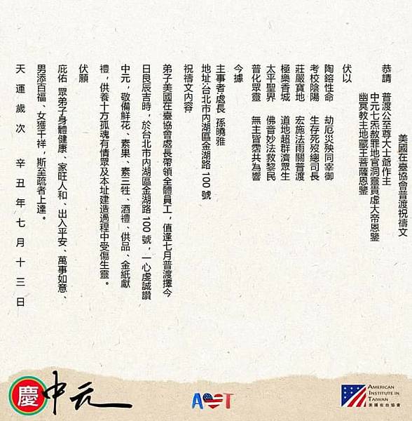 AIT中元普渡美金、祝禱文都有 網友狂讚專業