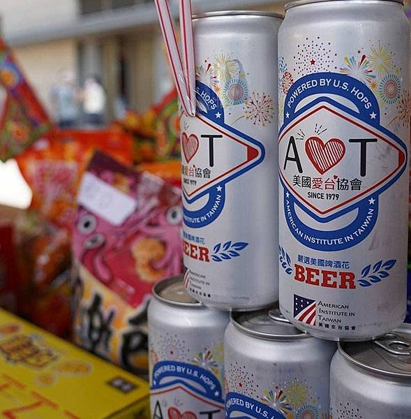 美國在台協會22日中元普渡大拜拜,美金冥紙(上圖)及特製愛台啤酒(下圖)讓網友歪樓。(合成畫面/取自AIT臉書)