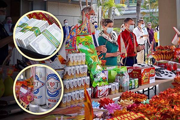 今天(22日)是農曆7月15日中元節,美國在台協會(AIT)處長孫曉雅、副處長柯傑民入境隨俗也跟著舉香拜拜,網友眼尖發現供品中不僅有「美金」,還準備印有「美國愛台協會」標誌的啤酒,直呼:「想跟團!超想喝!」