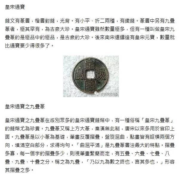 「九疊篆」用於錢文,在數千種古錢幣中,「皇宋通寶」僅為孤例,故被歷代收藏家視為稀世珍品