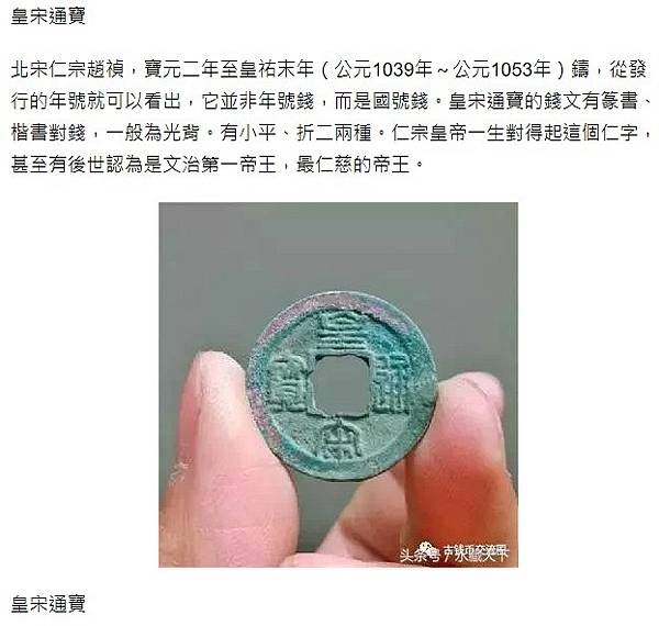 北宋仁宗趙禎,寶元二年至皇祐末年(公元1039年~公元1053年)鑄,從發行的年號就可以看出,它並非年號錢,而是國號錢。皇宋通寶的錢文有篆書、楷書對錢,一般為光背。有小平、折二兩種。仁宗皇帝一生對得起這個仁字,甚至有後世認為是文治第一帝王,最仁慈的帝王。