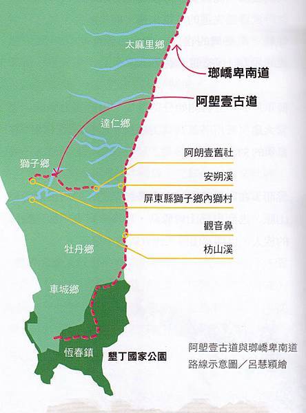 故我在粵東省城,收集一份台灣古道文獻:清末台灣南路沿東海岸官道可看出恆春縣城東行、後山海邊、大麻里,卑南。而阿塱壹是字字未題。據我所知清末時阿塱壹舊社位於現南迴公路山上,現阿塱壹新部落好像也是靠大武山森林非海邊,所以大家再研究吧!