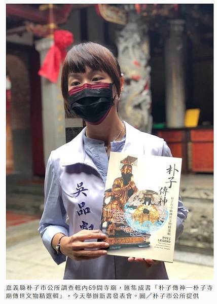 吳品叡說,朴子是嘉義縣海線重要宗教信仰中心,各寺廟內典藏極富歷史性、科學性及藝術性價值的文物,這本書精選各廟主神或老件神像168尊,將文物普查專業資料轉換成方便閱讀的文字,呈現宗教工藝之美,為朴子完整記錄重要的文化資產,希望能代代相傳下去,讓下一代也能了解自己家鄉的信仰沿革。