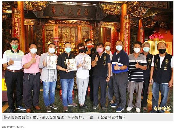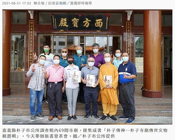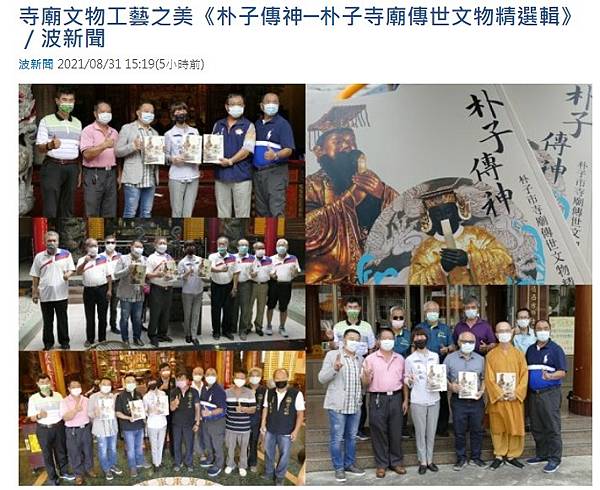 嘉義縣朴子市公所為詳實記錄各寺廟文物工藝之美,特於去年(109)底委託寺廟文物研究團隊「嵐厝創意企業社」,執行轄內69座寺廟文物調查及專書彙編事宜,書籍業已首刷出版,今(31)日,辦理新書發表會,因疫情關係由嘉義縣朴子市長吳品叡親手將書籍致贈配天宮蔡承宗董事長、高明寺陳英毅董事長、天公壇林博文主委、鎮安宮蔡宜雄主委,代表全市69間宮廟接受贈書,現場簡單隆重。
