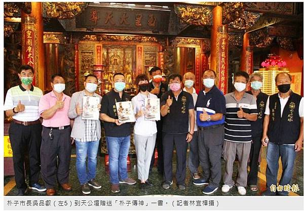 朴子市長吳品叡(左5)到天公壇贈送「朴子傳神」一書。(記者林宜樟攝)