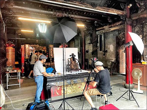 「新港傳神」踏查全新港鄉廟宇文物,為神像褪衣拍照前,還要先擲筊、詢問神明意願,成為調查過程中的有趣插曲。(記者王善嬿翻攝)