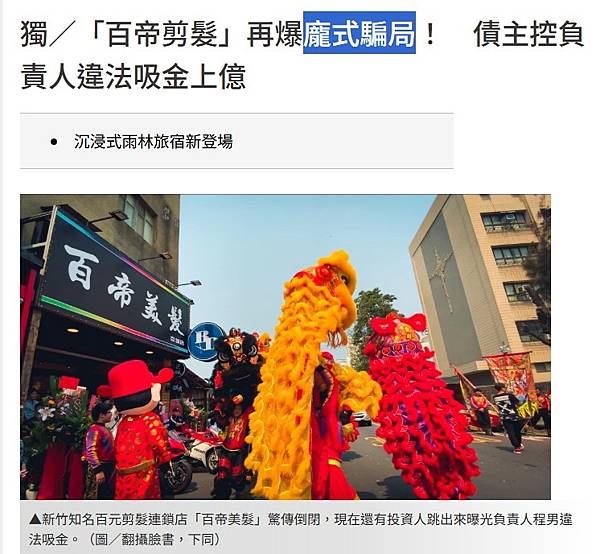 新竹百元剪髮連鎖「百帝美髮」驚傳倒閉-負責人違法吸金,數十名受害人,累積損失金額超過億元-利用「高投報-投資月息7~10%」的投資吸引大家參與投資 https://bit.ly/3I4QJ8v