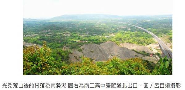 光禿荒山後的村落為南勢湖 圖右為南二高中寮隧道北出口。圖/呂自揚攝影