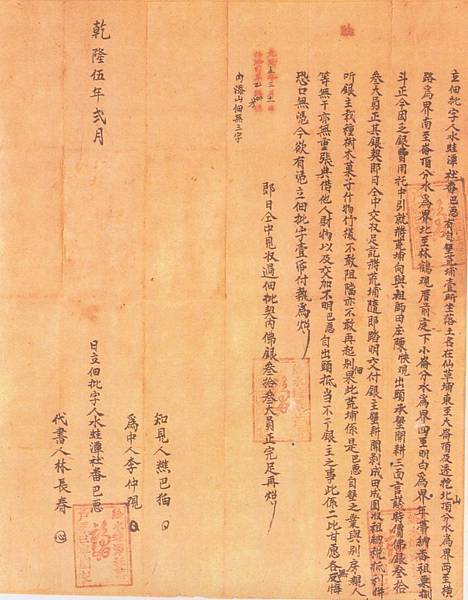 乾隆5年(1740)水蛙潭社土地佃批古契,是大崗山後現存年代最早土地古契。圖/陳春興存藏,作者提供