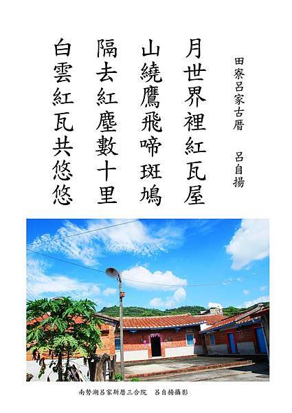 隔去紅塵數十里,白雲紅瓦共悠悠。–〈田寮呂家古厝〉
