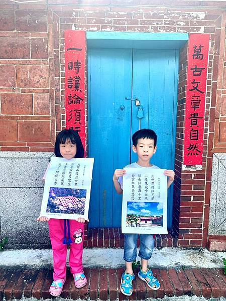 呂自揚2024 中秋回月世界呂家古厝的三合院新厝祭祖,雙孫手拿詩拍照