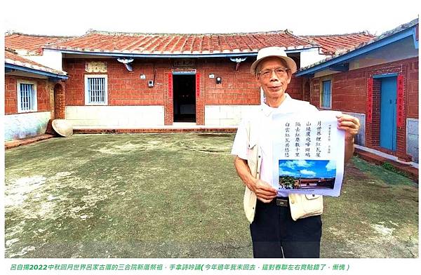 今年是農曆13日禮拜天,與家人回鄉祭祖,和2022年一樣,也帶著所寫〈田寮呂家古厝〉詩回去,在新厝三合院吟誦祭祖,並由二個孫子各拿著一首詩拍照紀念。相信祖先聽了看了知道了,雖然不識字,也會很高興。