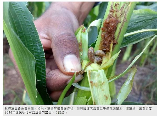 秋行軍蟲對非洲國家的危害嚴重,根據美國農業部資料,去年非洲南部的尚比亞,約15%的玉米作物都遭這種害蟲侵襲,在中國也導致玉米收成量減少4%。