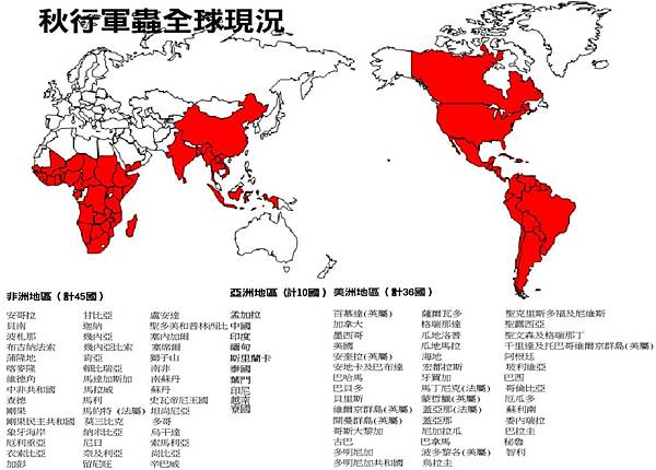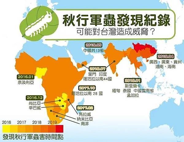 最新資訊顯示,根據農委會資料指出,非洲共有45國、美洲36國、亞洲10國深受秋行軍蟲影響。中國則已18省傳出災情,順著西南氣流看,海南島及廣東、廣西,鄰近台灣的福建、浙江都有危害紀錄。
