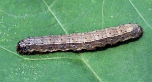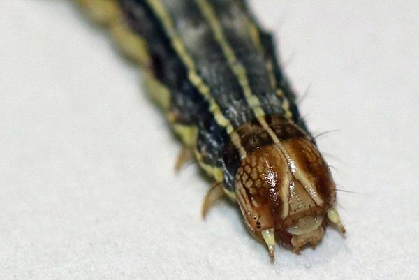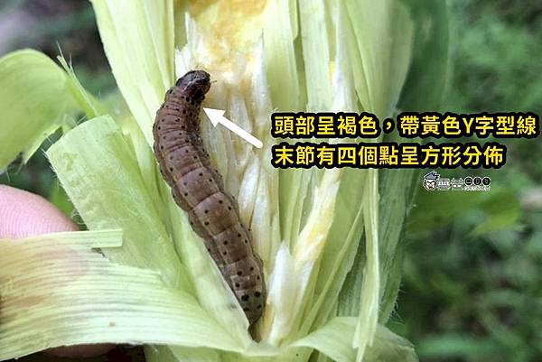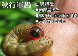 秋行軍蟲(Fall armyworm)的特徵,幼蟲頭殼有黃色倒Y型紋路,背部各體節有梯型狀分布的4個斑點,秋行軍蟲的外觀與斜紋夜盜蟲相近,威脅卻更加嚴重。