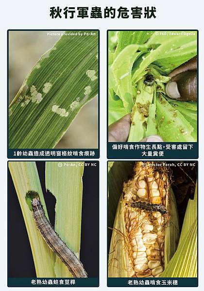 再加上對於廣食性昆蟲而言,若當前的寄主植物趨向單一化(例如只出現在玉米上),而沒有看到牠們向其他禾本科植物取食,意味著「牠剛到這裡不久」。基於以上種種要件,他推斷秋行軍蟲在台入侵僅是初期。