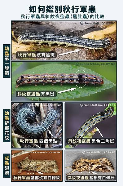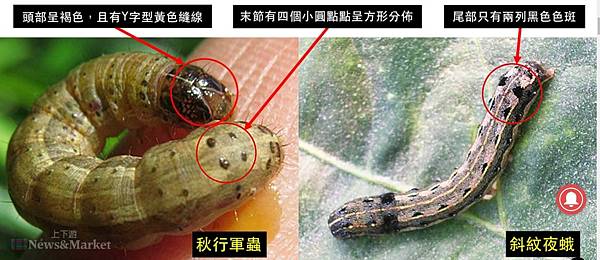 秋行軍蟲(左-James-Castner)及斜紋夜蛾(右-農業試驗所)幼蟲之區別(上下游資料照)