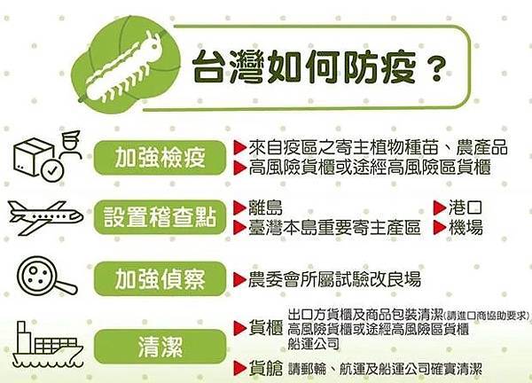 因此他指出,農產品、資材的跨國運輸與邊境管理十分重要,例如防檢局當前加強高風險貨櫃或途經高風險區貨櫃的抽檢及巡查,並請進口業者要求出口方落實貨櫃及包裝清潔,包含郵輪、航運及船運公司,做好清潔貨艙及貨櫃等工作,都是能降低秋行軍蟲從邊境入侵的方法。
