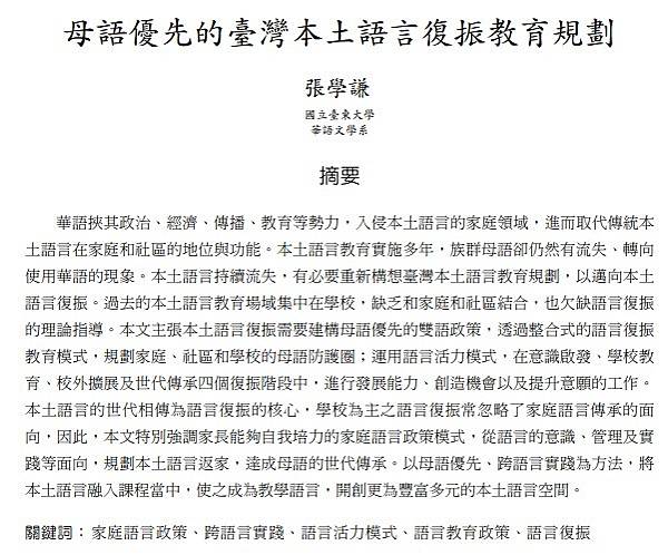 回歸語言保存的基礎:以家庭、社區為主的母語世代傳承--張學謙