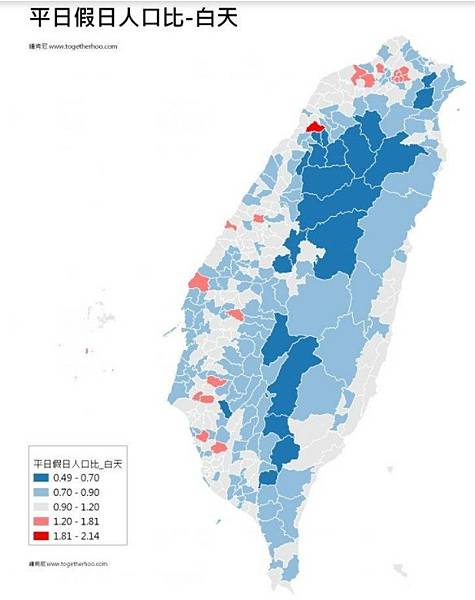 民眾喜愛旅遊的宜蘭、花蓮、台東,也呈現假日夜間停留人數比平日增加,且越靠近北部,人數差異越明顯,研判與返鄉或休憩者交通距離有關。