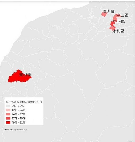 雙北特定區域旅次部分,早晨時段以台北車站、捷運站等大眾運輸為人口流量高峰,中午時段則以博愛特區等工商業區的交通站點為中心向外擴張,晚上時段則流入西門、永康、東區商圈等地。