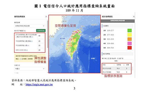 內政部表示,「電信信令人口統計資料」是運用基地台的訊號,進行新型態人口統計,並與商圈、公車站牌、醫療院所或便利超商等社會經濟空間資料,透過指數加權計算。公部門可運用在醫療、交通、人力調度、疫情、消防、房市等議題;民間組織也可依自身需求,彈性調整指標權重。內政部以夜間經濟、醫療資源以及疫情人潮風險為例說明數據應用。