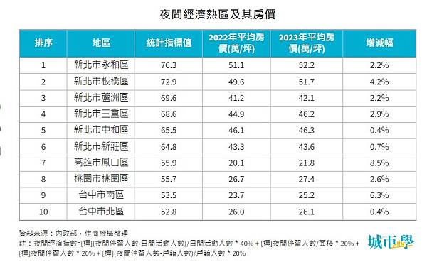 內政部編制的「夜間經濟指數」,以夜間停留人數、白天活動人數、戶籍人口、面積等數據加以加權計算,數值愈大,代表相對的夜間停留人數愈多,夜間經濟活動潛力愈大。