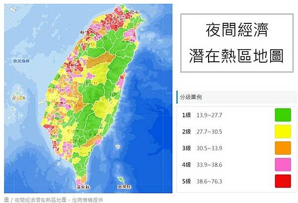 內政部指出,人潮即是商機,除了地區因素,不同時段人潮亦有差別,特別是夜間時段,差異更大。「夜間經濟潛在熱區地圖」,是考量日夜人數差異、夜間停留人數密度及外來人口流入等因子,加權產製夜間經濟指數,數值愈大,代表相對的夜間停留人數愈多,夜間經濟活動潛力愈大。