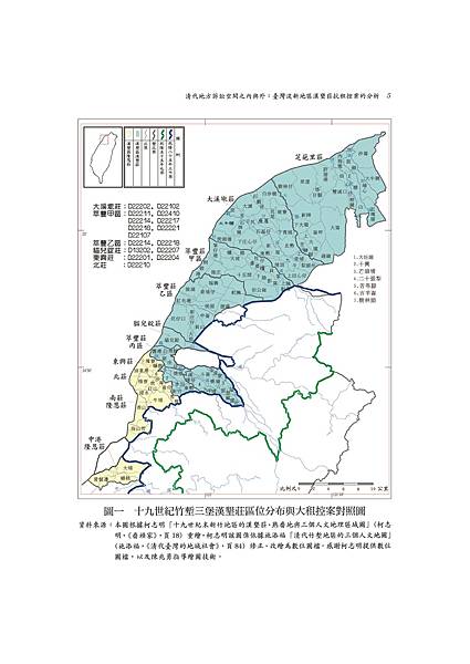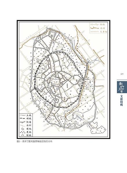具有遠離水患的優勢,又有十八尖山和古奇峰山泉孕育的小溪流,提供用水之便。在此客觀環境的前提下,徐治民卜定的廳治地點,乃以十八尖山前沿的一個盾狀丘地,作為最佳選擇。盾丘的中心,在今西安街與中山路會口附近,海拔20.28公尺。徐氏以此為中心,在四周環植莿竹,修建竹城。在主觀環境方面,廳治竹塹城,位於新竹平原依山面海的風水吉穴之上。在傳統觀念裡,一般認為地有地氣、水有水氣、人有人氣;氣旺則盛、氣弱則衰、氣散則亡。因此,民間選擇宅地、官方選擇衙署或治地時,通常考察山川形勢及方位,尋求氣之所在,且能藏得住氣的地點,作為決定宅地、衙署或治地的依據。一般而言,一個能「藏風聚氣」的地點,其背後需有高起的山岳,稱為「樂山」。樂山之後,尚有與高大山脈銜接的山嶺護衛,稱為「龍脈」;其左右兩側,要有小丘,分別稱為「左龍山」、「右虎山」。中央則為平坦寬廣的高地,稱為「明堂」,明堂即「穴」的所在。明堂之前要有略低而廣袤的田野,稱為「砂」;前方不遠處,還要有低矮的山丘,稱為「案山」;兩側要有溪流向前方流去,並逶迤至遠處。 25竹塹城的城址,以五指山為祖山,北以橫山(大山背)、南河山為右肩外衛,南以獅頭山、三灣山為左肩外衛,龍脈從五指山第三峰(中指)順山足圓崗逶迤而西至金山面,金山面為少祖山。由少祖山向西北、西南,再分右、左兩護拱衛廳治。右護順柴梳山、黃金洞山(建功里北緣),越頭前溪、鳳山溪至鳳山崎,再西延至鳳山鼻(鳳鼻頭);左護沿大崎山、石屑崙山、茄苳湖山、隙仔山(客雅山),延至香山鼻。龍脈自金山面西下,經出栗湖(新竹科學工業園區管理站南)至十八尖山。十八尖山是父母山(樂山),從父母山再右沿枕頭山(今中山公園),是右虎山;左順虎頭山,是左龍山。左龍右虎環抱的明堂,就是廳治城址的吉穴。 26 吉穴前有沙丘虎仔山,是為案山;明堂廣闊,左右復有客雅溪與頭前溪迤邐來去,具有「龍脈融貫,地氣獨鍾;歛之既歸,發之愈廣。」的風華,也擁有「眾山皆盡,真氣擬焉」的氣勢。(圖1)城址卜定後,徐治民旋先環植莿竹建竹城,稱竹塹城。嘉慶11年至嘉慶18年間(1806-1813)官民為防民亂,又再竹城外圍築土城;道光初年,廳治已發展成「民居輻輳,街市環連」之局,但卻「□□變遷,徒剩譙樓之四壁;風霜剝落,竟殘渭戶之千竿。夜行免斅雞鳴,而八達四通難防狗盜。」為了避免「廳治轉同村落」,地方士紳舖戶乃透過閩浙總督向朝廷奏請,願意踴躍輸誠捐派,「不動公帑一絲」,祈求新建石城;奏朝廷准許後,於道光7年至9年間(1827-1829),在竹城、土城間另建磚城