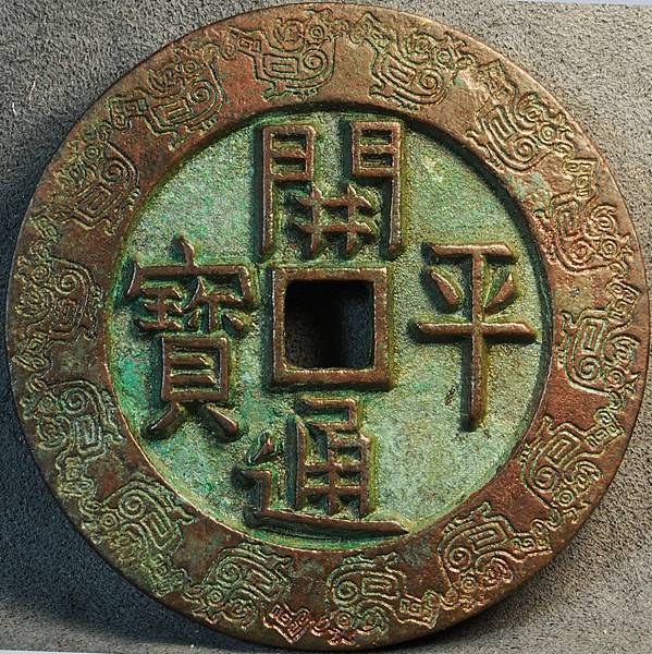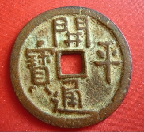 開平通寶錢它的形體仿照開元錢,但鑄造製作上更粗糙,邊廓不整齊。其錢徑約3.4厘米,重量不能測定。鑄造的「開平通寶」四個字,以隸書書寫,從上往右旋讀。這種鑄造的錢世上流傳極少,世上流傳的小平的「開平通寶」為「開元通寶」挖補以後改刻所成,還有一種被稱為「當十開平元寶」的,經鑒定為贗品。