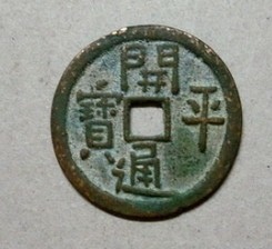 開平為五代梁朱溫年號(公元907~911),存世錢幣有「開平通寶」,「開平元寶」各一枚,由於皆系孤品,有無確切的史料記載,真偽難辨,此外,存世有少量開平元寶小鉛錢。「開平通寶」生坑有紅綠銹,而「開平元寶」熟坑無銹。「開平通寶」一般被認作為真品,而「開平元寶」之證偽尚待考證。