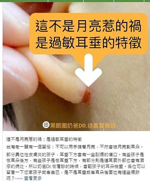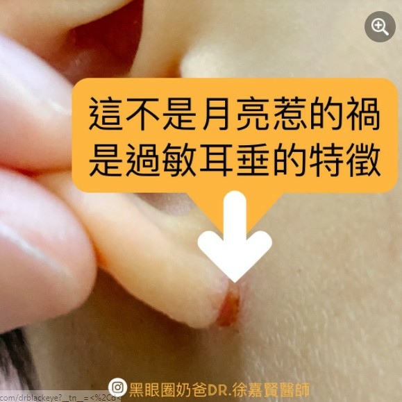 對此,兒科醫師徐嘉賢曾在「黑眼圈奶爸Dr. 徐嘉賢醫師」臉書提到,台灣老一輩有一個習俗:不可以用手指著月亮,不然會被月亮割耳朵;部分異位性皮膚炎的孩子,耳垂下方會有一些刮痕的傷口,有些孩子是在耳朵後方,有些孩子是在耳垂下方,有部分則是連耳廓外部也會有濕疹的病灶。