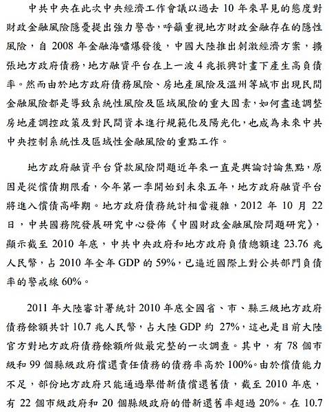 美國評級機構「穆迪投資人服務」上週報告說,中國收緊LGFV的債務監督,將促使許多地方政府擴大其商業曝險,以產生資金流。穆迪分析師鍾汶權(Ivan Chung)說:「中國LGFV的商業活動若延伸至採礦或房地產等高風險事業,恐增加信用風險。」