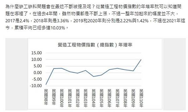 為什麼缺工缺料問題會在最近不斷被提及呢?從營造工程物價指數的年增率就可以知道問題在哪裡了。在過去4年間,雖然物價都是不斷上漲,不過一整年加起來的幅度並不大,2017是2.4%,2018年則是3.36%,2019和2020年則分別是2.22%與1.42%,不過在2021年迄今,累積平均已經多達10.03%。