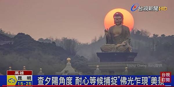 外交部推廣台灣人文的平台「Trending Taiwan潮台灣」也介紹,「大佛懸日」是台灣佛教四大山之一佛光山奇蹟美景,當太陽在低仰角時,陽光穿過大氣層的路徑較長,太陽顏色會偏橘或橘黃,搭配角度適宜的地點,就會形成懸日。
