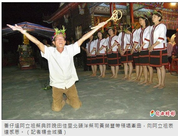 西拉雅族蕭壟社七股番仔塭阿立祖祭典昨天登場,佳里北頭洋、將軍角帶圍族親也來參加阿立祖三向祭典,表達對阿立祖的感恩,重頭戲是昨晚十點唱牽曲、燒神船。