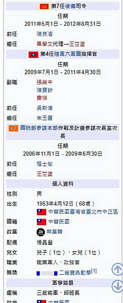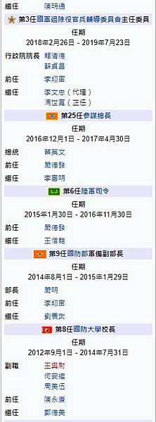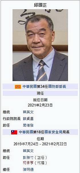邱國正(1953年4月12日-)[3],中華民國陸軍二級上將退役,生於臺北市中正區,籍貫江蘇省灌雲縣,現居永和區,美國陸軍戰爭學院、南非陸軍參大[需要解釋]、陸軍官校正45期裝甲兵科、螢橋國小畢業,為中華民國國軍留美將領之一,駐外武官出身,現任國防部長,曾任國安局長、退輔會主委、參謀總長、陸軍司令、國防部副部長、國防大學校長、後備司令、陸軍六軍團指揮官、參謀本部作戰次長、陸軍六軍團副司令、陸軍總司令部作戰署長、陸軍裝步373旅長、駐南非武官。 邱國正 - Google 搜尋